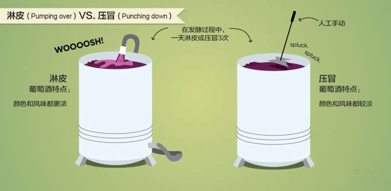 压冒(Punching down)则是一种更加温和的方法,可避免过度萃取的后果,也不会将过多氧气带入发酵罐中。压冒过程都是人工操作,在尽量减少人工干预的大环境下,备受酿酒们的青睐。
